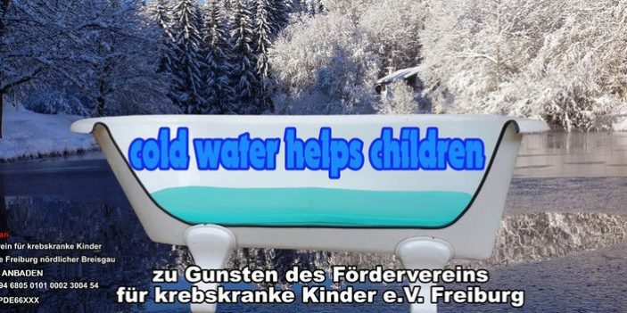 Vom 6. Dezember bis 6. Januar läuft die Charityaktion „Cold water helps children“. Ins Leben gerufen hat sie Hans-Dieter Rahner, der mit seinem ehrenamtlichen Team jedes Jahr außergewöhnliche Spendenaktionen organisiert. Die Teilnehmer dürfen den Austragungsort selbst bestimmen und ihre Erinnerungsfotos per Mail oder soziale Medien an den Veranstalter schicken. Die Challenge: Eine Minute in kaltem Wasser, z. B. einem Teich oder einer Regentonne, sitzend, liegend oder knietief stehend durchhalten. Wer möchte, kann ein freiwilliges Startgeld von 10 Euro bezahlen. Die Spenden kommen dem Förderverein für krebskranke Kinder e.V. in Freiburg zu Gute.