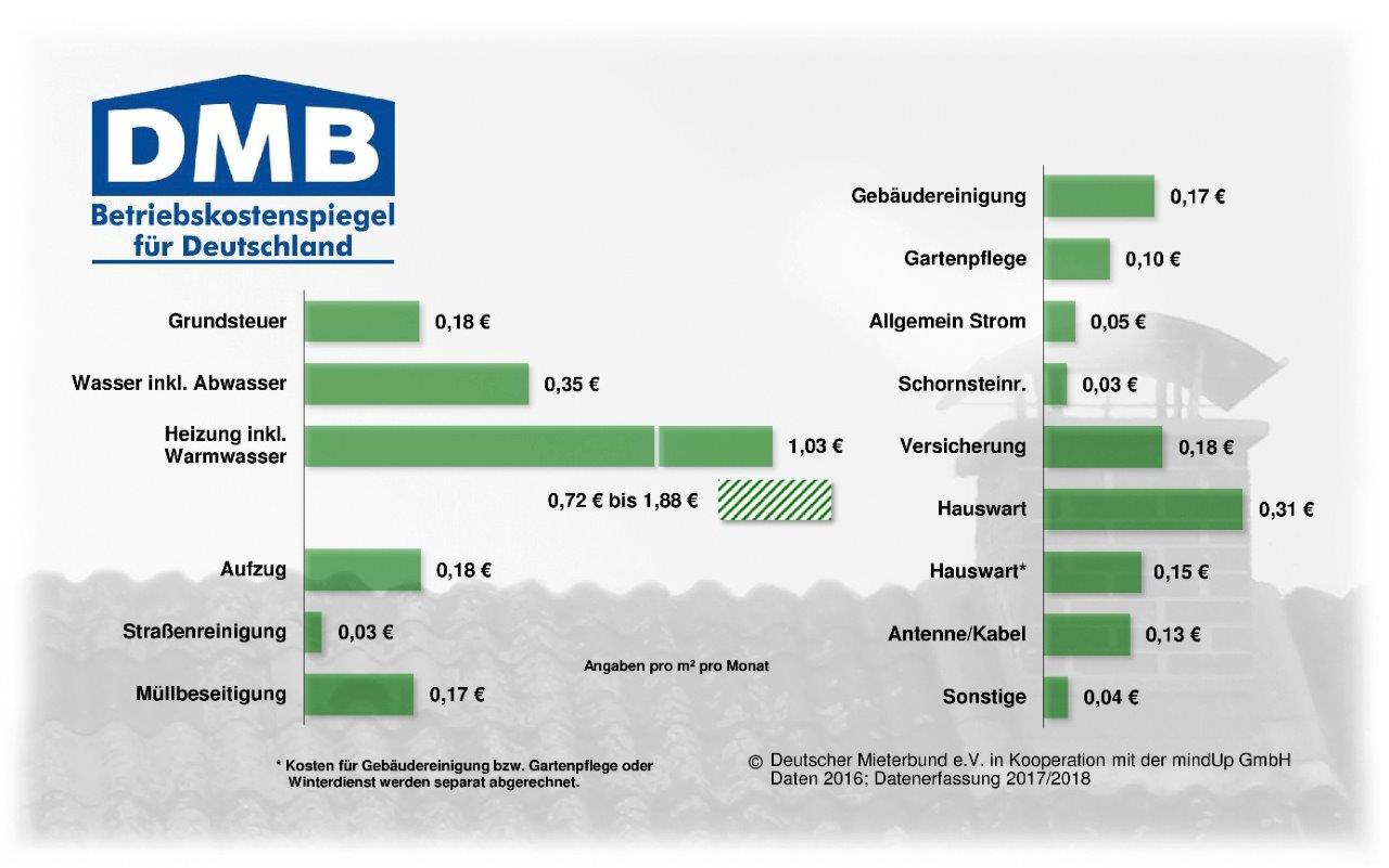 In § 556 BGB ist geregelt, dass der Vermieter auf die Wirtschaftlichkeit der Betriebskosten zu achten hat. Der Vermieter ist dazu angehalten, Preise von Anbietern zu vergleichen. Überhöhte Gehälter für Reinigungspersonal oder Hausmeister, unsinnige Anschaffungen oder Versicherungen müssen entfallen. Aber wie stellt man nun fest, was wirtschaftlich ist und was nicht? Hierzu lohnt sich ein Blick in den Betriebskostenspiegel des deutschen Mieterbundes (siehe Grafik).