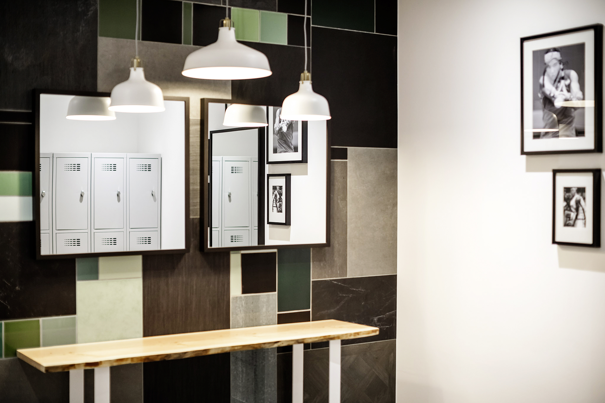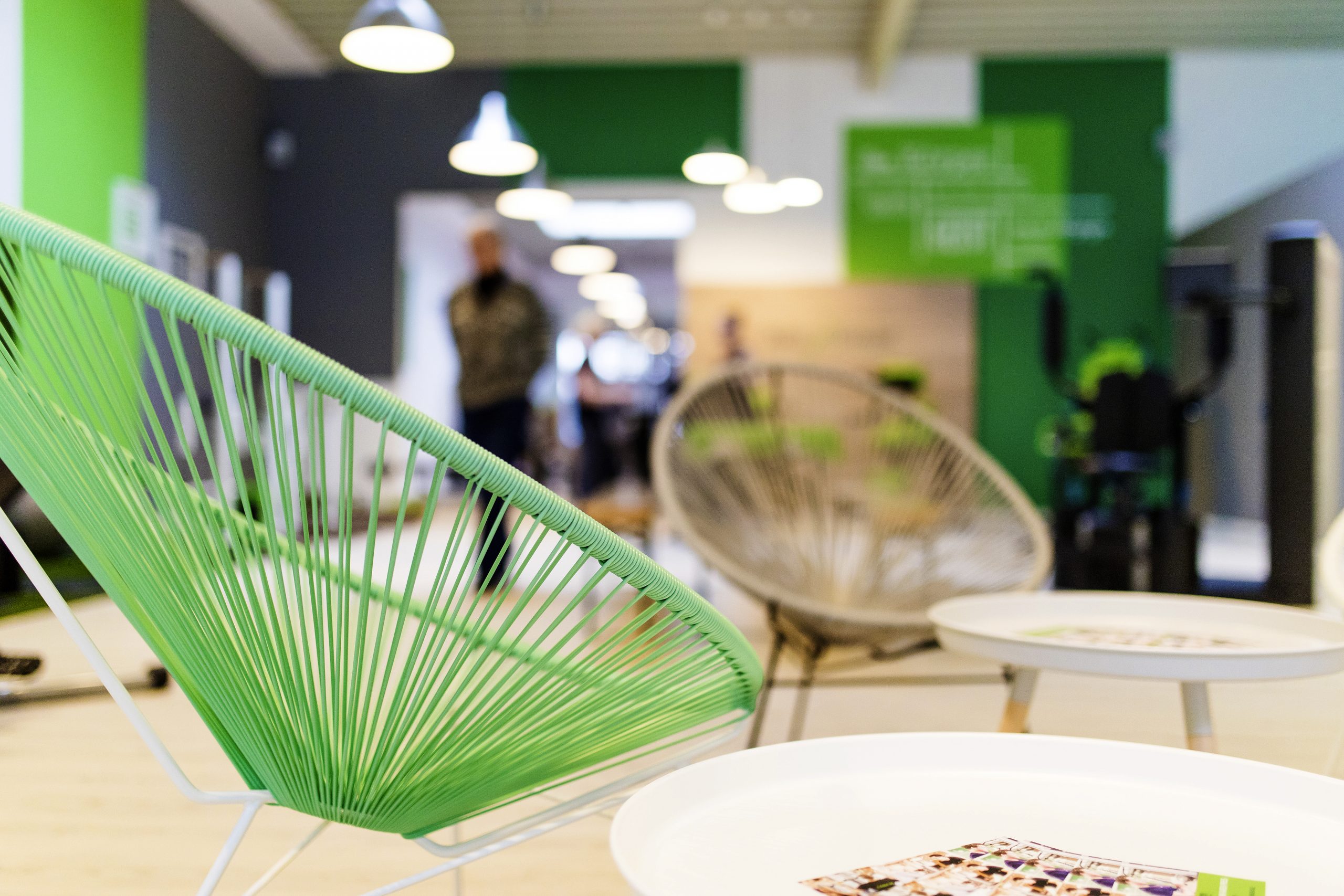 Eine Theke findet man in den Clubs nicht. Dafür werden die Mitglieder von einem Trainer empfangen. „Wir geben das Geld, das wir in die Theke investieren könnten, lieber für einen guten Trainer aus“, erläutert Schwarz. Das thekenlose Studio setzt sich in der Umgebung immer mehr durch: „Andere Clubs machen es uns nach“, so der Inhaber. Statt Theke befindet sich aber rechts neben dem Eingang eine Lounge, in der die Mitglieder nach dem Training verweilen können. In der Mitte steht ein EGYM-Zirkel auf einem Podest. Dahinter geht es zum Kursraum, in dem u. a. Yoga, Pilates und Functional Training stattfinden. An den Kursraum schließen der Functional-Training-Bereich und die Cardiofläche an.
