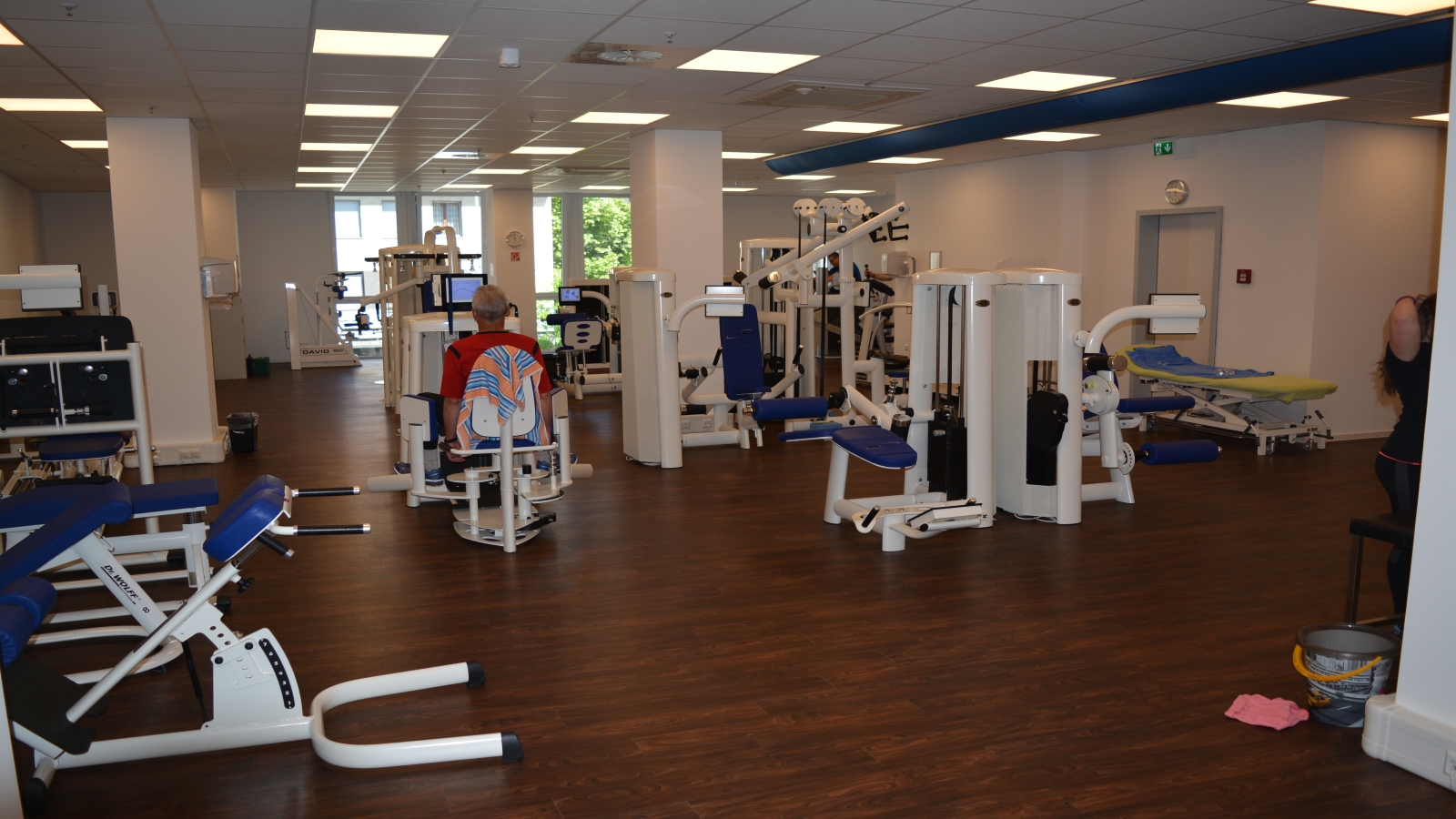 Im ersten Obergeschoss befindet sich das Rehazentrum, das über den Fitnessbereich zu erreichen ist. Das MediFit therapiert fachbereichsübergreifend in Physiotherapie, Ergotherapie und Logopädie. „Unser Ansatz ist, dass wir im Obergeschoss die Probleme lösen und im Erdgeschoss die Probleme vermeiden“, erklärt Jan Boese. Für Entspannung sorgt zudem der Sauna- und Wellnessbereich im Untergeschoss.