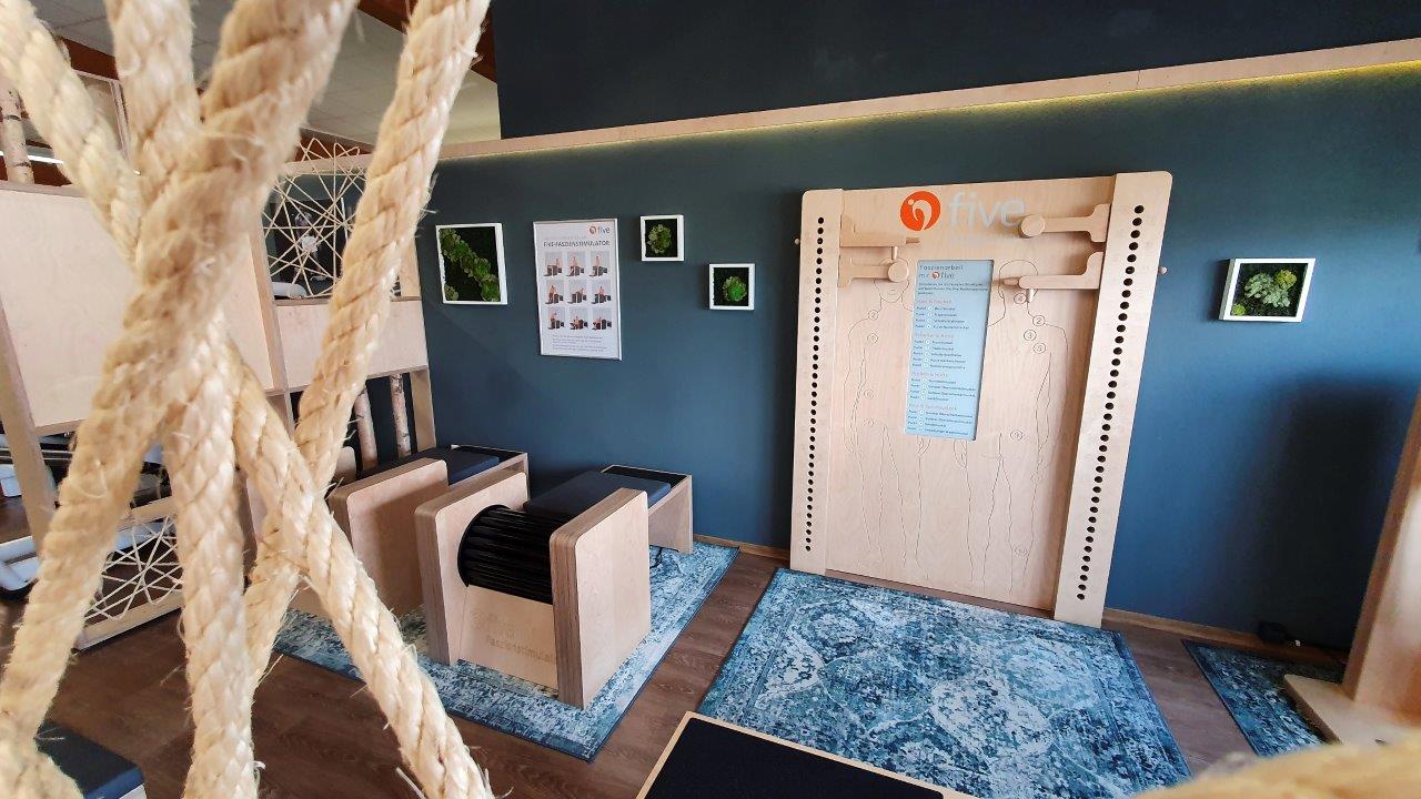 Das Studio befindet sich auf einer einzigen Ebene. Gleich hinter dem Checkin und somit schon beim Betreten des „MurgParks“ gut sichtbar ist der five- Bereich. „Ein echter Eyecatcher unseres Studios“, sagt Bohn. Zu five hat der 30-jährige Betreiber eine besondere Beziehung: Er lernte die Geräte schon früh während seines Angestelltenverhältnisses in Clubs kennen und schätzen. Der studierte Fitnessökonom besuchte bereits diverse Schulungen von Wolf Harwath und gibt auch selbst Neuro-Mobility-Workshops für das Unternehmen. Harwaths Schwiegermutter war zudem bei der Einrichtung des Studios federführend. So zieht sich die Holzoptik der five-Geräte durch den gesamten „MurgPark“.