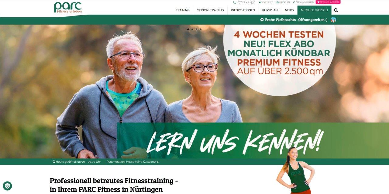Die Mitglieder finden auf einer Etage, und verteilt auf 2 500 m² alles, was es für ein hochqualitatives Fitness- und Gesundheitstraining braucht. Zwei Trainingsbereiche machen das „PARC Fitness“ aus: Im „Fitnessrondell“ sind u. a. das gesamte EGYM-Trainingssystem mit insgesamt 24 Geräten und ein fle-xx-Beweglichkeitszirkel untergebracht. In der „Heldenhalle“ – sieben Meter hoch und gestaltet im Comichelden-Look – befindet sich die Workout-Area mit Bereichen für Kraft-, Cardio-, Freihantel-, Zirkelund Functional Training. Mit Innen- und Außensaunen kommt auch die Wellness nicht zu kurz. Im August 2021 kam ein 250 m² großes Outdoor-Gym über den Dächern von Nürtingen dazu.