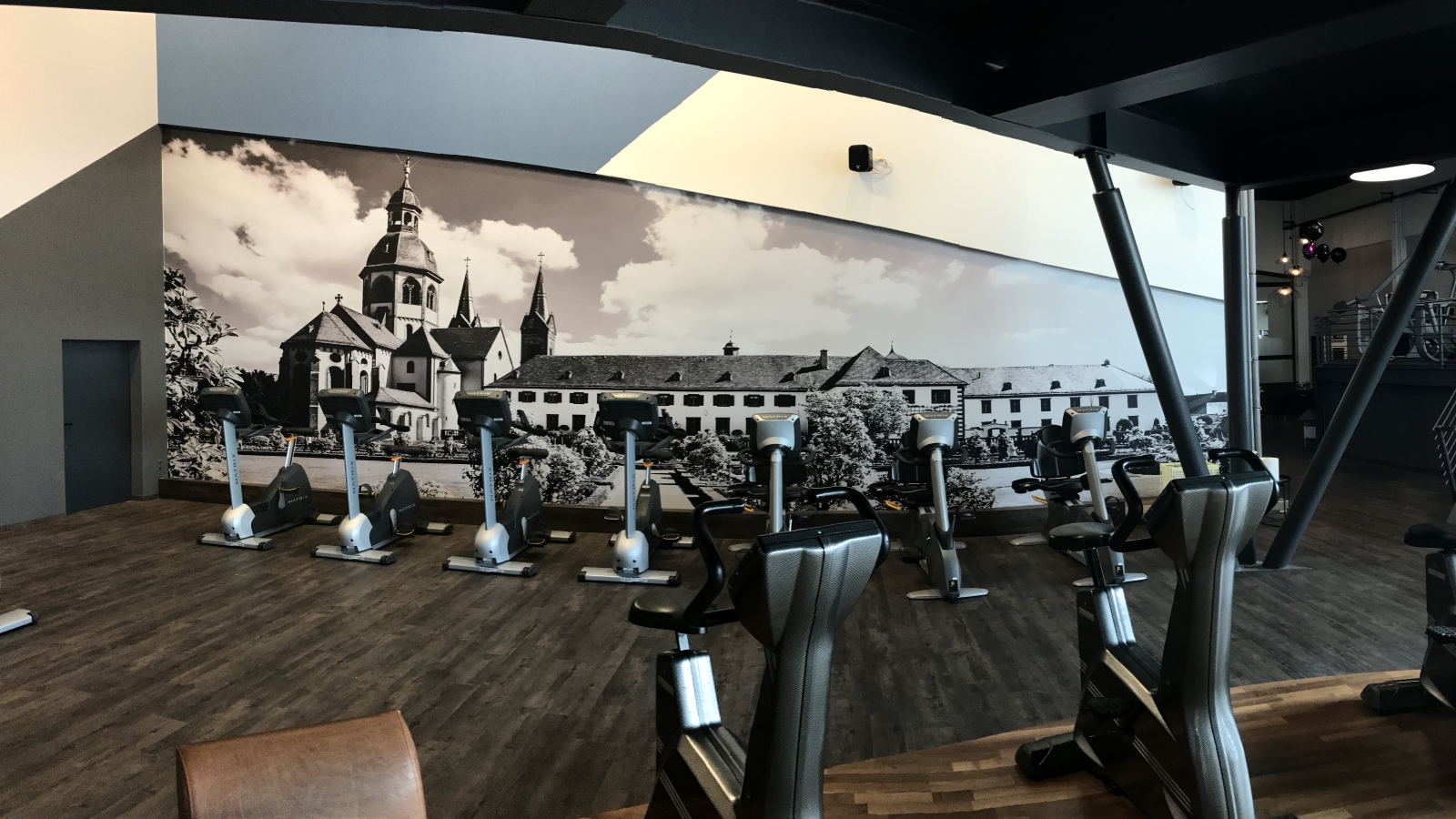 Im VITA NOVA gibt es nicht die Trainingsfläche – die einzelnen Trainingsbereiche erstrecken sich auf mehreren Ebenen. Die verschachtelte Aufteilung hat ihren Charme. Die hohen Räume tragen ebenfalls dazu bei, dass ich bei meinem Studiorundgang mit Günter Agsten aus dem Staunen nicht mehr herauskomme. Bereits vor etlichen Jahren waren zwei ehemalige Tennisplätze in einer Tennishalle umgestaltet und Zwischenebenen eingezogen worden. Vom unteren Bereich, wo Cardiogeräte und ein milonZirkel platziert sind, führt eine Stahltreppe nach oben, wo die Mitglieder an Kraftgeräten trainieren können. Bei der Ausstattung setzte der Betreiber ausschließlich auf modernste Geräte, wie z.B. den efle-xx-Zirkel und die MatrixVollausstattung im Freihantelbereich. Die einzelnen Bereiche werden optisch gekonnt in Szene gesetzt. Immer wieder wird durch Bilder mit historischen Motiven, wie zum Beispiel das Kloster in Seligenstadt, der Bezug zur Stadt hergestellt. Der Kontrast zwischen modernem Gerätepark und stilvollem Design mit historischen Elementen schafft eine angenehme Atmosphäre. Für das Designkonzept zeichnet Romina Etll von Fifty Fifty Design verantwortlich.