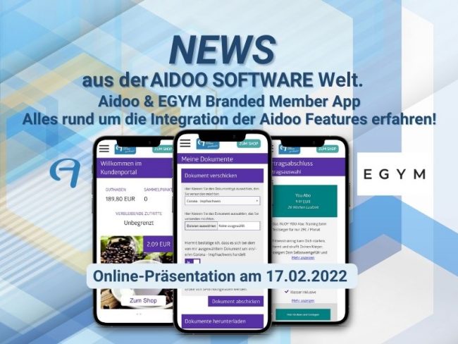 Aidoo Software GmbH ǀ Ab sofort können über die neue Aidoo-Schnittstelle zu EGYM alle Features der Aidoo-Onlinewelt in die EGYM Branded Member App integriert werden.