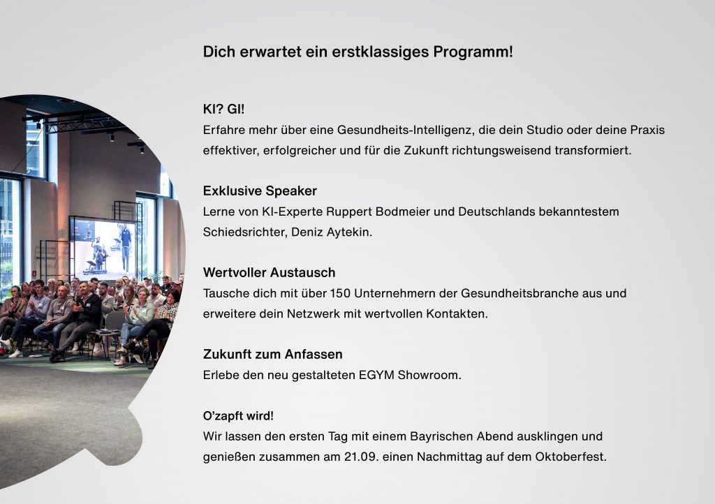 Deniz Aytekin, einer der bekanntesten Schiedsrichter Deutschlands und Keynote Speaker – wissenschaftlich fundiert und mit spannenden Analogien aus dem Profifußball. - Großes Reopening unseres Showrooms in der Münchner EGYM-Zentrale mit anschließendem Bayrischen Abend (20.09.)