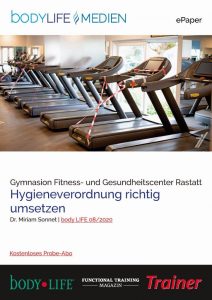 Ein sehr gutes Beispiel, wie Mitglieder und Mitarbeiter bestmöglich geschützt werden können, liefert das „Gymnasion Fitness- und Gesundheitscenter“ in Rastatt. Die Inhaber haben die Hygieneverordnung perfekt in ihr Gesamtkonzept integriert. Darüber hinaus erstellten sie eigene Regeln, die zusätzlich für Sicherheit sorgen sollen. Eine davon ist es, eine Maske zu tragen, wenn nicht gerade trainiert wird. „Das kommt nicht bei allen Mitgliedern gut an und einige beschweren sich darüber“, sagt Maren Grothe, stellvertretende Geschäftsführerin. Das sei aber kein Grund, diese Regel wieder auszulösen, denn der Schutz der Menschen stehe im „Gymnasion“ an erster Stelle. Betritt ein Mitglied das Studio, muss es zunächst seine Hände desinfizieren und sich danach anmelden. Externe Gäste werden mit Namen und Telefonnummer in eine Liste eingetragen, um mögliche Infektionsketten später rückverfolgen zu können. An der Theke finden die Mitglieder DIN-A4- Zettel, auf denen sie die Regeln des Studios nachlesen können.
