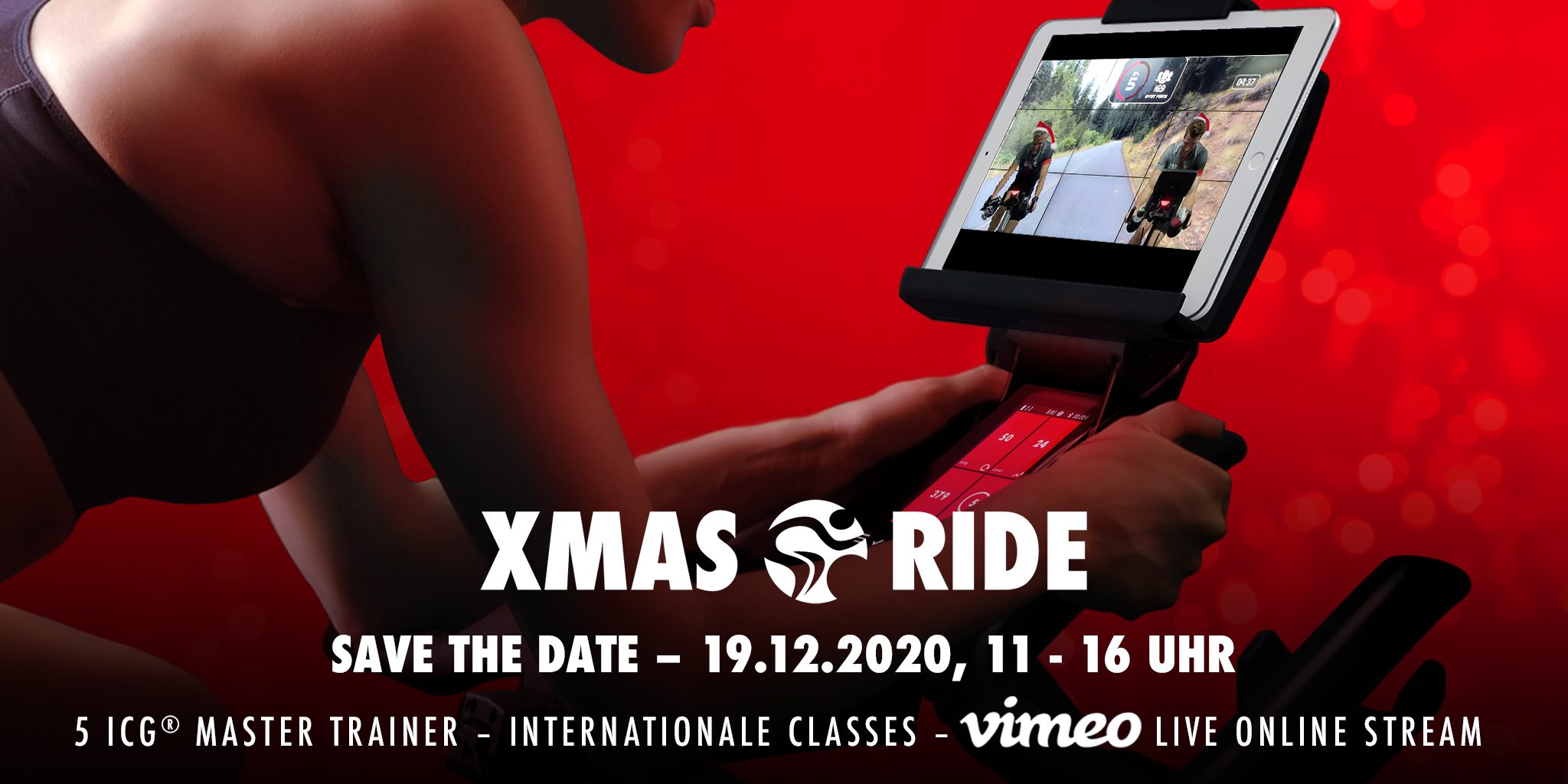 Indoor Cycling Group ǀ Die Indoor Cycling Group veranstaltet in diesem Jahr erstmals den ICG XMAS-Ride, ein fünfstündiges Online Cycling-Event am 19. Dezember. Der Ride läuft von 11 bis 16 Uhr und ist über den Vimeo Kanal des ICG Teams weltweit zugänglich. Fünf ICG Master Trainer werden auf Deutsch sowie auf Englisch den XMAS Ride leiten. Teilnahme unter folgendem Link: www.teamicg.online/xmasride. Weitere Informationen gibt es über die Team ICG-Social Media-Plattformen.