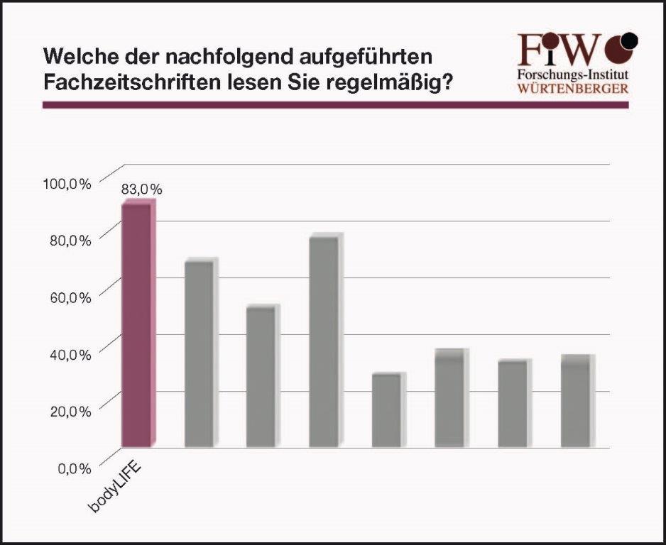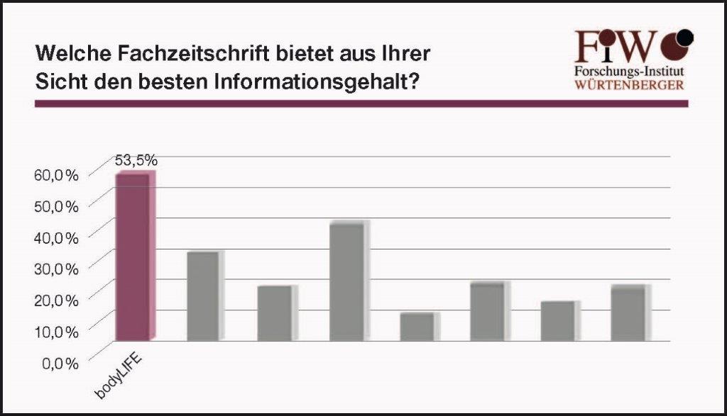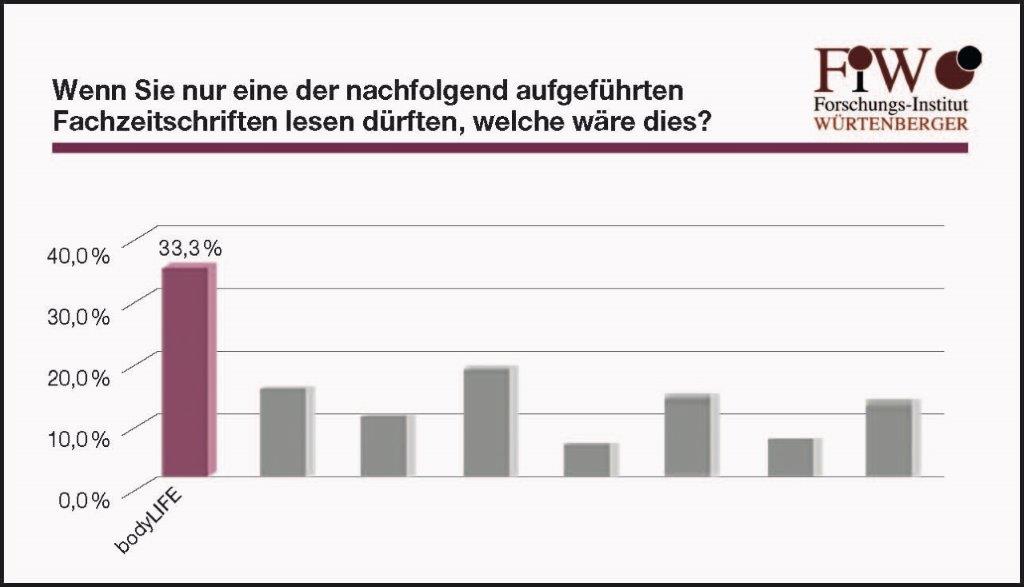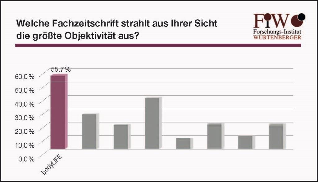 Die Ergebnisse stimmen uns freudig und machen uns stolz, sind aber zugleich auch Ansporn: So erzielten wir in den Befragungen nach der Bekanntheit, dem regelmäßigen Konsum und der Objektivität neue Bestnoten. 83 Prozent der Befragten lesen wiederum regelmäßig die body LIFE (siehe Abbildung 1). 33,3 Prozent gaben an, dass sie sich für die body LIFE entscheiden würden, wenn sie nur eine Zeitschrift lesen könnten (siehe Abbildung 2). Den besten Informationsgehalt attestierten der body LIFE 53,5 Prozent der Befragten (siehe Abbildung 3) und 55,7 Prozent gaben an, dass die body LIFE die größte Objektivität habe (siehe Abbildung 4).